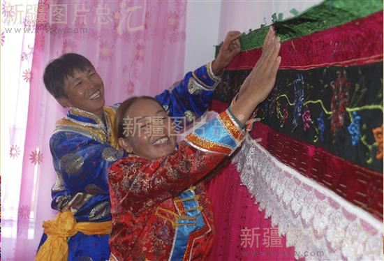 2011年9月19日,新疆温泉县扎勒木特乡浩图尔哈队牧民巴音宝勒德与妻子在布置新搬进的定居房。