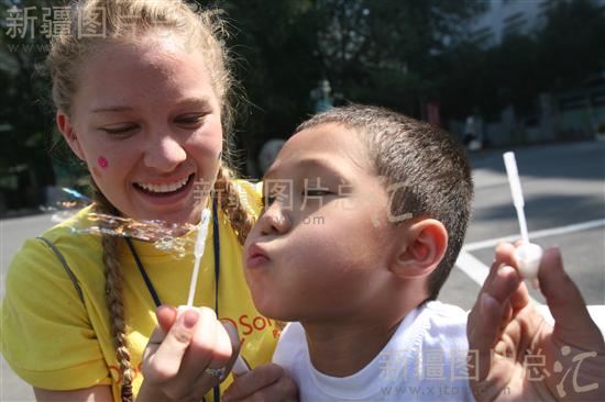 2008年8月23日,来自喀什的6岁唇裂患儿卡依色尔江前来复诊,与来自美国的志愿者Carla一同嬉戏。