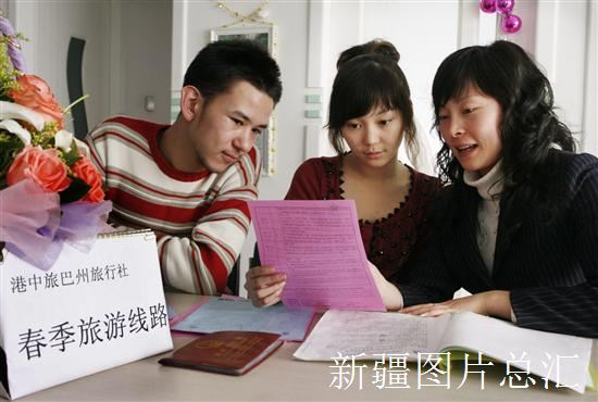 2008年2月27日,库尔勒市两位准备出国旅游的年轻人在旅行社咨询旅游事宜。据了解,随着库尔勒市市民生活水平的不断提高,越来越多的市民想走出国门看看外面的世界,增长见识。