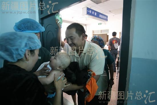 2008年8月24日,阿图什市松他克乡农民苏帕洪欣喜地从护士手中接过刚做完手术的、8个月大的儿子艾力木江。