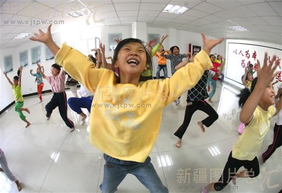 2008年8月21日,9岁的李京京按时来到乌鲁木齐市新民路街道办事处南大湖社区农民工子女艺术团,开始一天的舞蹈训练。随着欢快的舞蹈节奏,京京和小伙伴们重复着每一个舞蹈动作。一场“热舞”下来,孩子们的汗水已湿透衣襟。