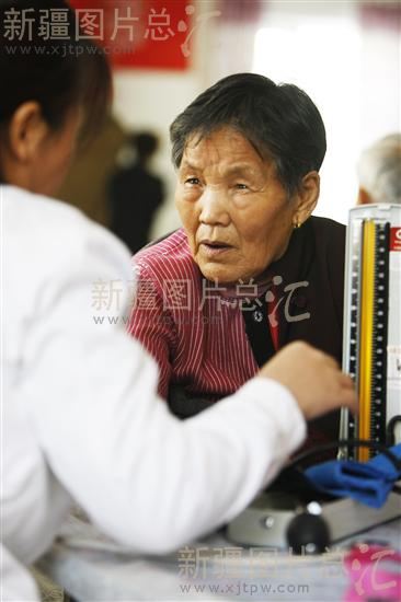 2013年10月14日,阿勒泰市妇幼保健院的护士,给居住在该市福利院的一位老人量血压。