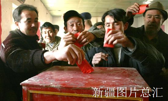 2008年2月20日,若羌县铁干克乡果勒吾斯塘村村民们正在村级换届选举大会上投票选举第七届村委会候选人。 当日,若羌县村级换届选举工作依法有序中结束。选民们为自己心目中的村干部投上神圣的一票,选出自己满意的村级"当家人"。