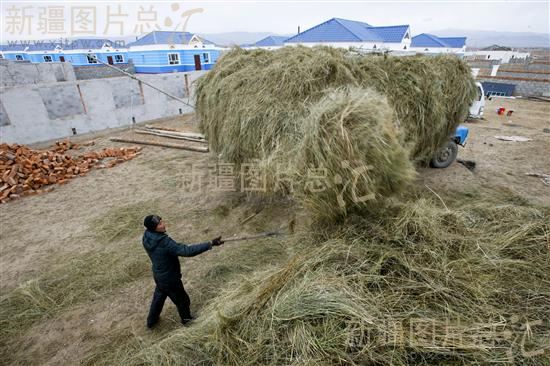 2013年10月25日,在阿勒泰市切木尔切克镇阔克哈木斯牧民定居点,牧民萨达提在整理饲草。