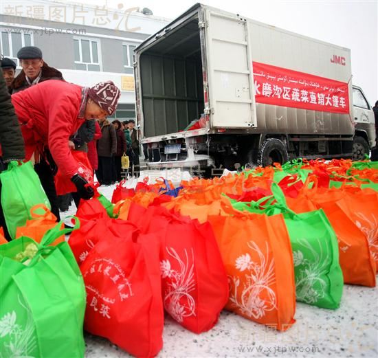 2011年12月31日,乌鲁木齐市水磨沟区石人子沟村村民在领取蔬菜。为缓解农牧区群众买菜难、买菜贵问题,水区推出了“蔬菜直销大篷车”的新销售模式,即把蔬菜运到村里直销。相关负责人表示,今后将定期向该区边远村镇开出“蔬菜直销大篷车”,销售农民生活必须的25种蔬菜。