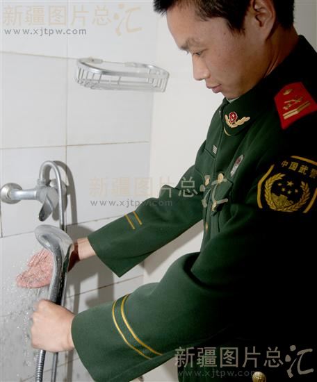 2013年11月20日,一名老兵正在检查洗澡水的温度。