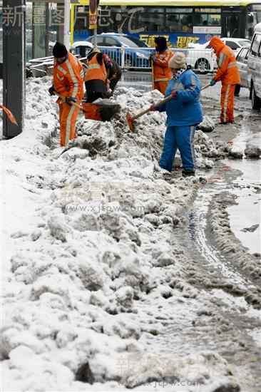 2013年11月21日,在乌鲁木齐市扬子江路上,环卫工人在清理积雪。