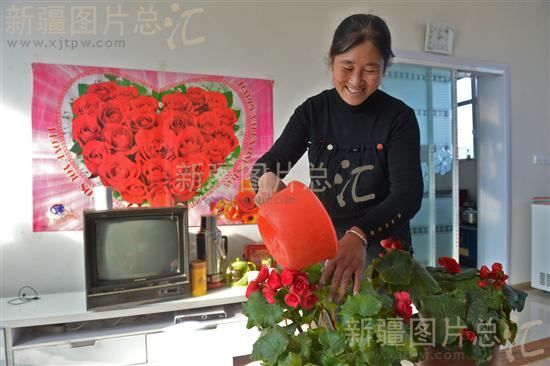 2013年11月20日,新疆巴里坤哈萨克自治县奎苏镇南湾村,村民秦海珍在客厅里浇花。