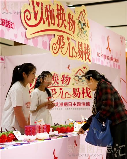 当日,由乌鲁木齐市防艾滋病工作委员会和乌鲁木齐市疾病预防控制中心主办的“以物换物,爱心易栈”关爱艾滋病家庭活动在乌市启动。据了解,此次主办方已从贫困艾滋病感染者家庭中征集了一些手工艺品,志愿者在社区、高校等处摆放爱心摊位,爱心人士可用米、油等生活必需品来换取手工艺品。此次公益活动为期3天。