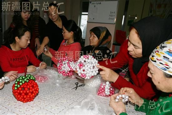2011年11月25日,各族居民在乌鲁木齐市黑甲山片区大湾北路西社区学习工艺品制作。
