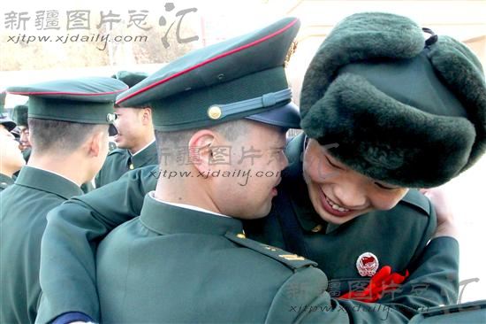2013年12月2日,新疆哈密军分区一名退伍战士在和老班长告别。