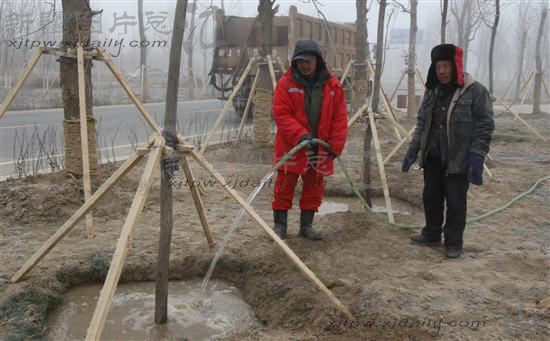 2013年11月29日,两名园林工人在给树木进行冬灌保墒。