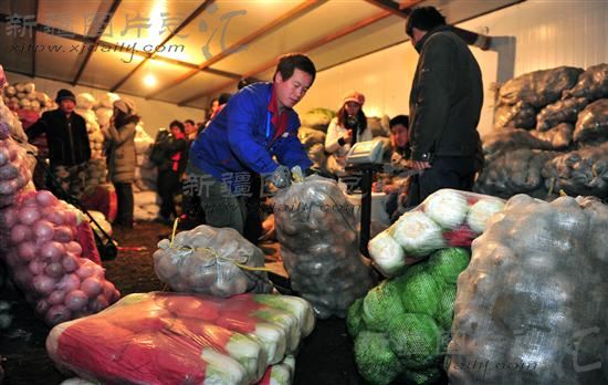 2012年12月11日,在乌鲁木齐市北园春蔬菜批发市场“乌鲁木齐市政府储备菜投放点”,工作人员在为各直销店选配蔬菜。