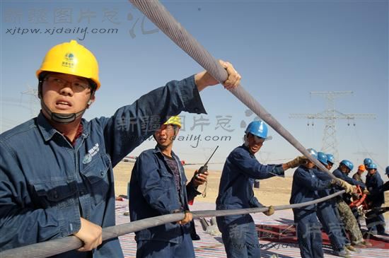 新疆哈密南至河南郑州±800千伏特高压直流输电工程工地上,电力建设者在架设导线(2013年3月27日摄)。
