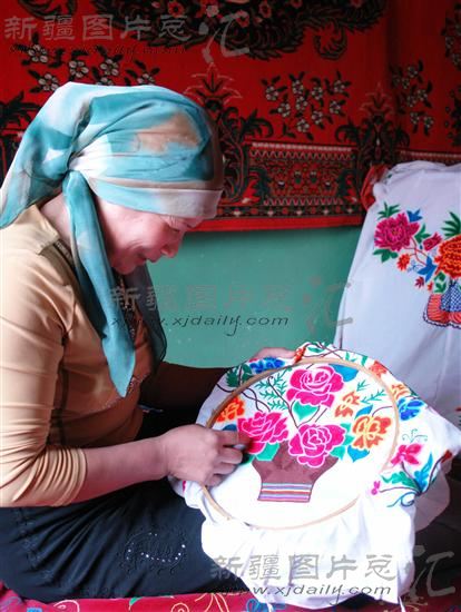 2007年04月03日,在新疆吐鲁番市恰特卡勒乡其盖布拉克村,帕提古丽·吾尤甫在家里绣制精美的桌布。这些刺绣作品都拿到艾丁湖旅游景区销售。