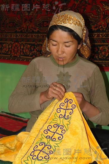 2007年04月03日,一位维吾尔族妇女在家里做刺绣活。