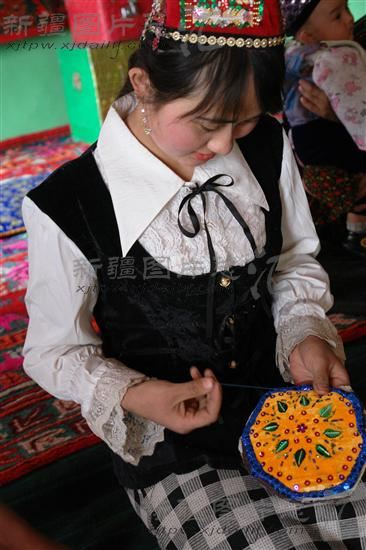 2007年04月03日,在新疆吐鲁番市恰特卡勒乡其盖布拉克村,佳丽帕·阿不力孜在绣制精美的枕头套。