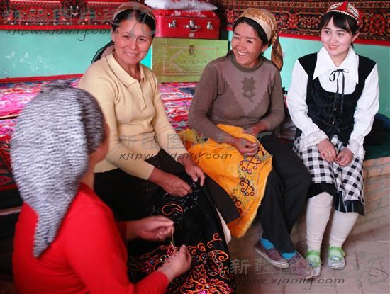 2007年04月03日,在新疆吐鲁番市恰特卡勒乡其盖布拉克村,妇女们在一起交流刺绣经验。
