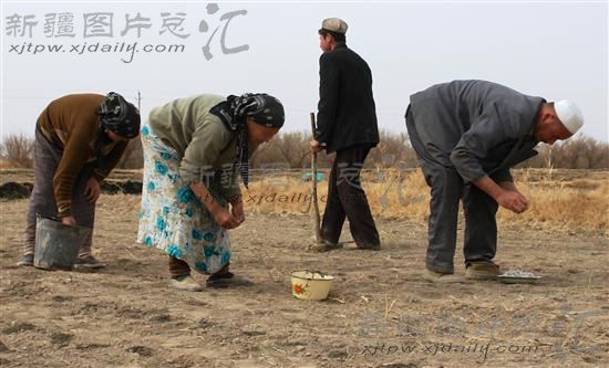 2007年04月03日,在新疆吐鲁番市恰特卡勒乡其盖布拉克村,村民在地里点种棉花。