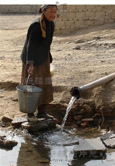 2007年03月17日,在新疆吐鲁番市恰特卡勒乡其盖布拉克村,一位妇女在村里唯一的水源地取水。