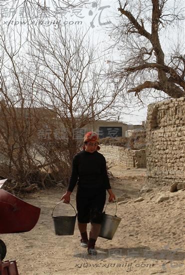 2007年03月17日,在新疆吐鲁番市恰特卡勒乡其盖布拉克村一位妇女往家里提水。