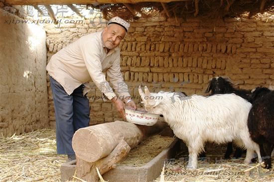2007年03月17日,在新疆吐鲁番市恰特卡勒乡其盖布拉克村,村民帕塔尔·赛尔丁在喂养家中的27只羊。帕塔尔还种了17亩孜然,一年能有两万多元收入。