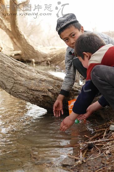 2007年03月17日,新疆吐鲁番市恰特卡勒乡其盖布拉克村,两名维吾尔族男孩在渠边戏水玩耍。