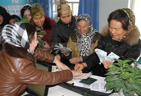 2013年12月6日,温宿县温宿镇英巴格社区工作人员在为低保户发放医疗保险补贴。