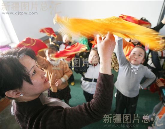 2008年4月3日,老师在教孩子们学习京剧里手帕的转法。乌鲁木齐市第12小学将京剧作为该校的校本课程,并聘任了专业京剧演员做教师,开设京剧艺术表演班。据了解,京剧班的孩子们经常参加省、市、区电视台举办的各类演出及比赛,并获得好成绩。