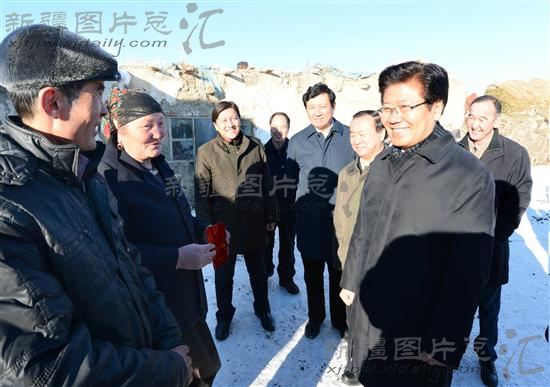 2013年1月7日,中共中央政治局委员、自治区党委书记张春贤在新疆塔城地区托里县库甫乡哈拉乔克冬牧场考察,了解定居牧民的生活及冬季草料储备情况。