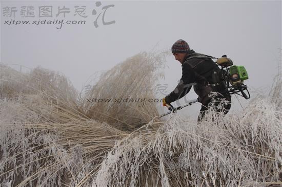 2013年12月5日,新疆生产建设兵团第二师21团职工吐尔地江在开都河畔收割芨芨草。吐尔地江说,他收割芨芨月收入有几千元。入冬以来,该团各族职工利用冬闲时节采取多种方式增加收入。