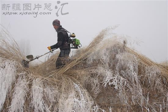 2013年12月5日,新疆生产建设兵团第二师21团职工吐尔地江在开都河畔收割芨芨草。吐尔地江说,他收割芨芨月收入有几千元。入冬以来,该团各族职工利用冬闲时节采取多种方式增加收入。