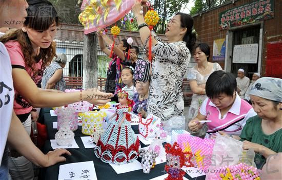 2011年7月27日,社区居民在购买残疾人制作的手工艺品。当日,乌鲁木齐市沙依巴克区残联与雅玛里克山片区青年社区,共同开展了残疾人手工编织工艺作品现场制作、义卖活动,帮助残疾人士树立自信、更好地融入社会。