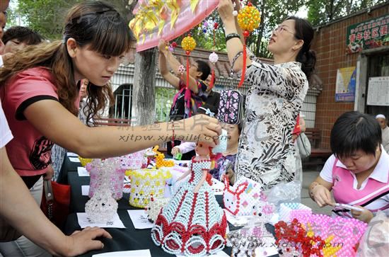 2011年7月27日,社区居民在购买残疾人制作的手工艺品。当日,乌鲁木齐市沙依巴克区残联与雅玛里克山片区青年社区,共同开展了残疾人手工编织工艺作品现场制作、义卖活动,帮助残疾人士树立自信、更好地融入社会。