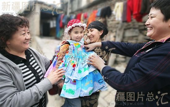 2008年4月15日,徐惠(左)与徐荣姐妹为麦迪努尔试穿新裙子。当天,乌鲁木齐市水磨沟区苇湖梁街道新光社区下派干部联系爱心志愿者为辖区孤寡老人、困难家庭子女捐赠价值5000多元的衣物,并为他们解决生活上的困难,受到好评。