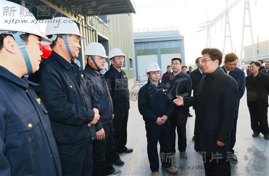 2013年11月26日,张春贤书记在哈密至郑州正负800千伏特高压直流电工程哈密南换流站考察时与企业工人交谈。