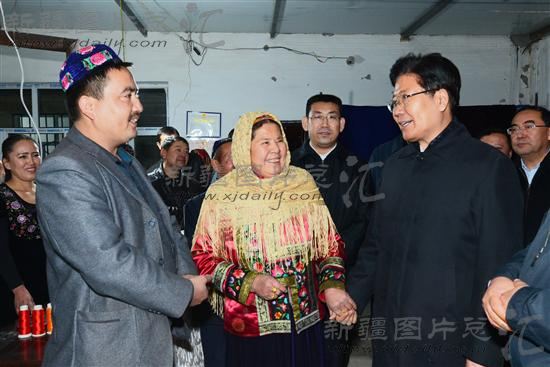 2013年11月26日,张春贤书记在哈密市回城乡哈密阿加汗特色产业发展有限公司考察时,看望民族刺绣传承人阿加汗·赛买提。
