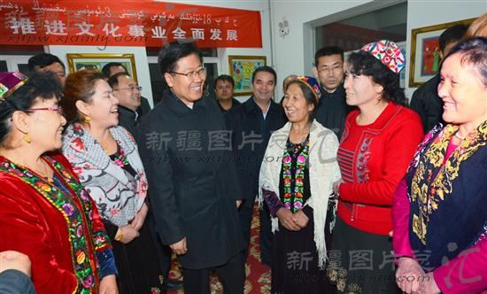 2013年11月26日,张春贤书记在哈密市回城乡文化站考察时,与村民交谈。