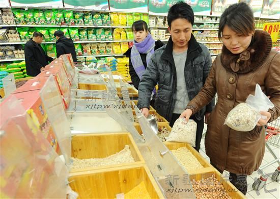 2013年1月18日,库尔勒市民在超市购买熬制腊八粥的原料。1月19日是农历腊月初八,俗称腊八节,在我国民间有吃腊八粥的传统习惯。今日在库尔勒市部分超市,杂粮很受消费者的欢迎,销售量呈上升趋势。