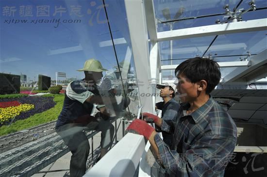 2011年8月24日,工人在位于乌鲁木齐市会展大道的人行通道出口处安装玻璃。