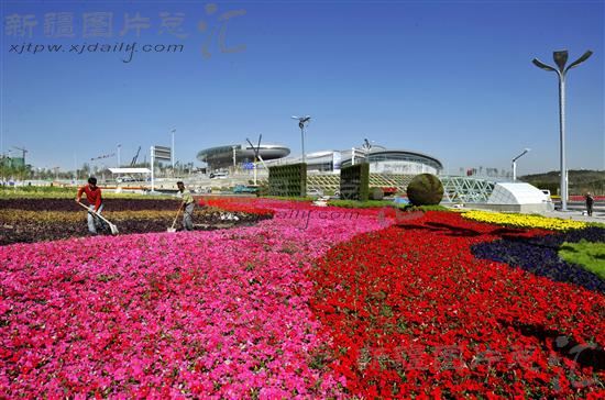 2011年8月24日,园林工人在新疆国际会展中心周边进行绿化工作。