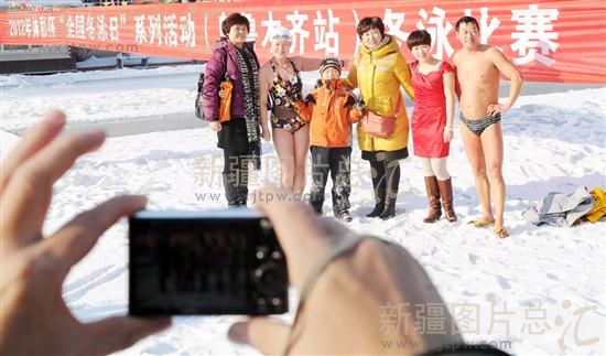 2012年1月1日,市民与冬泳爱好者合影留念。当日,2012年体育彩票杯“全国冬泳日”系列活动(乌鲁木齐站)冬泳比赛在乌鲁木齐市红山冬泳俱乐部举行,来自该俱乐部的400多名会员参加了比赛。