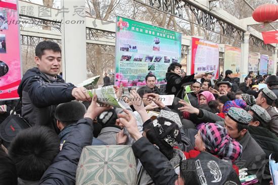 2013年2月25日,在新疆吐鲁番市举办的自治区2013年“春风行动”招聘会现场,工作人员发放农民工外出务工实用手册。