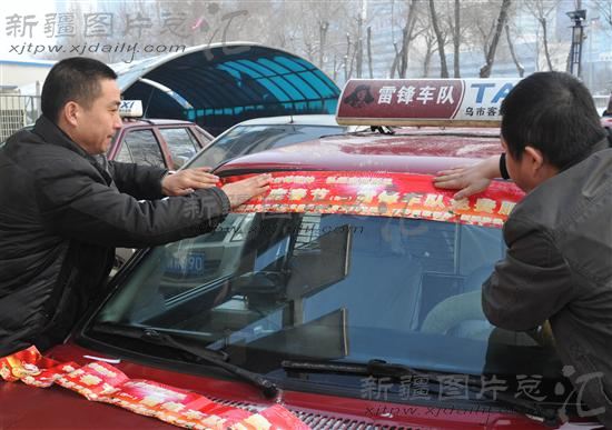 2013年2月10日,雷锋车队出租车司机在出租车上张贴志愿服务团队横幅。