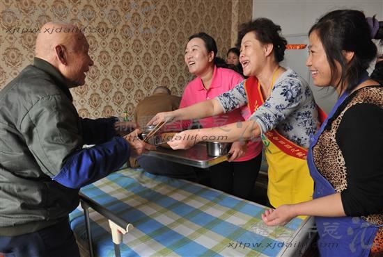 2013年2月10日,志愿者时新海(右二)为乌鲁木齐市福乐园老年公寓颜炳乾老人端上热腾腾的饺子。