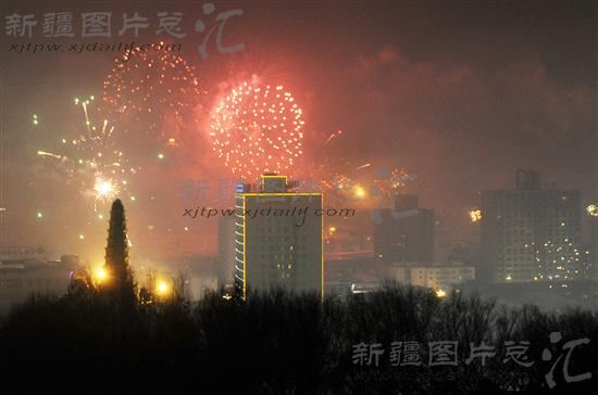 2013年2月9日零时许,乌鲁木齐夜空各色烟花竞相绽放,一片火树银花不夜天的景象。