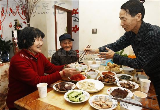 2013年2月8日,新疆昌吉市六工镇新庄村村民高国帮和来自昌吉市中心敬老院的孤寡老人卢凤莲(左一)、梁有恕(左二)一起吃团圆饭。当日,该敬老院的12位孤寡老人,被当地10户家庭接到家里一起过年。