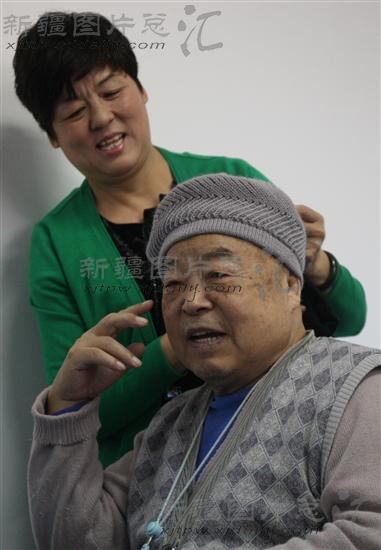 2013年12月12日,50岁的爱心妈妈徐凤霞正在为73岁的赵凡升老人戴上棉线帽子。