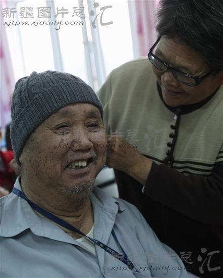 2013年12月12日,75岁的爱心妈妈续秀芝(右)正在给76岁的闫允礼老人戴上棉线帽子。