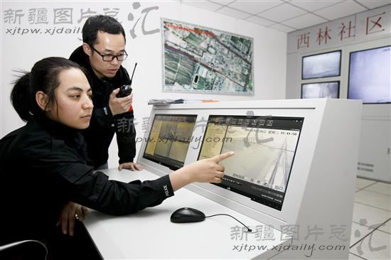 2013年11月26日,在乌鲁木齐经济技术开发区(头屯河区)西林社区的视频分控室,工作人员在查看监控画面。